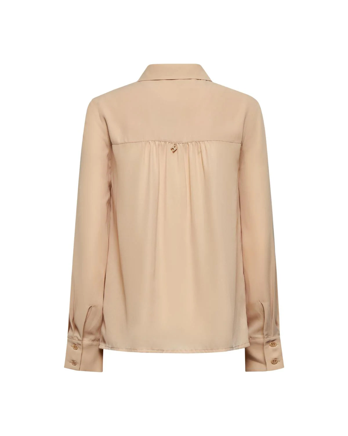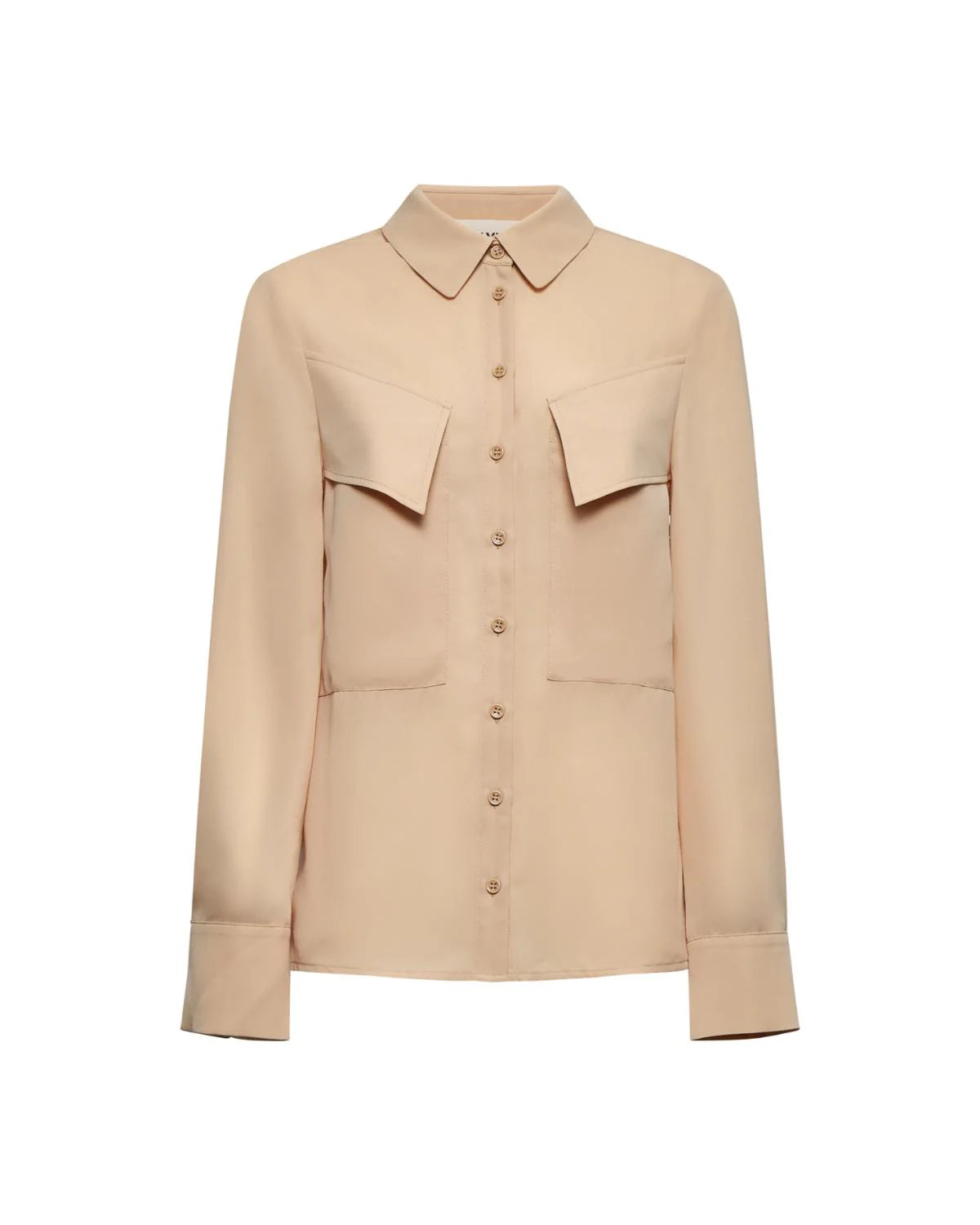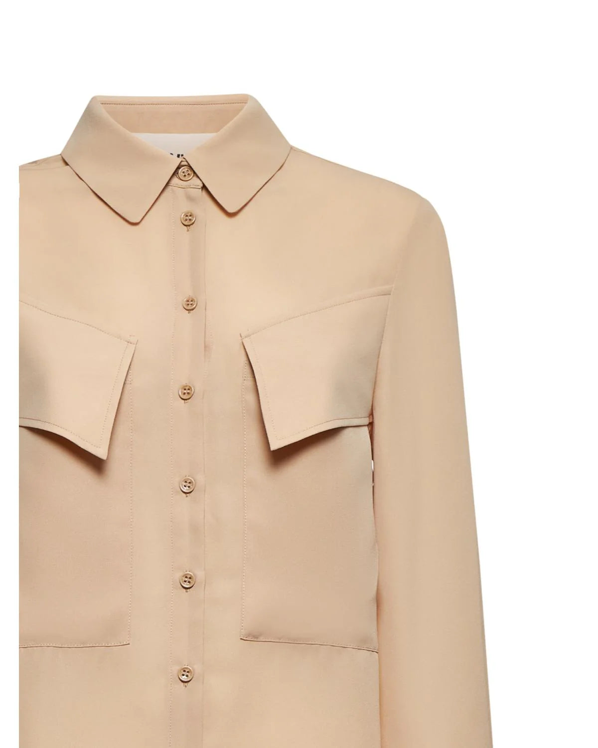 Een soepelvallend overhemd met twee opgestikte zakken op de borst. Een utility-look en vrouwelijkheid komen samen in een eenvoudig te combineren kledingstuk.