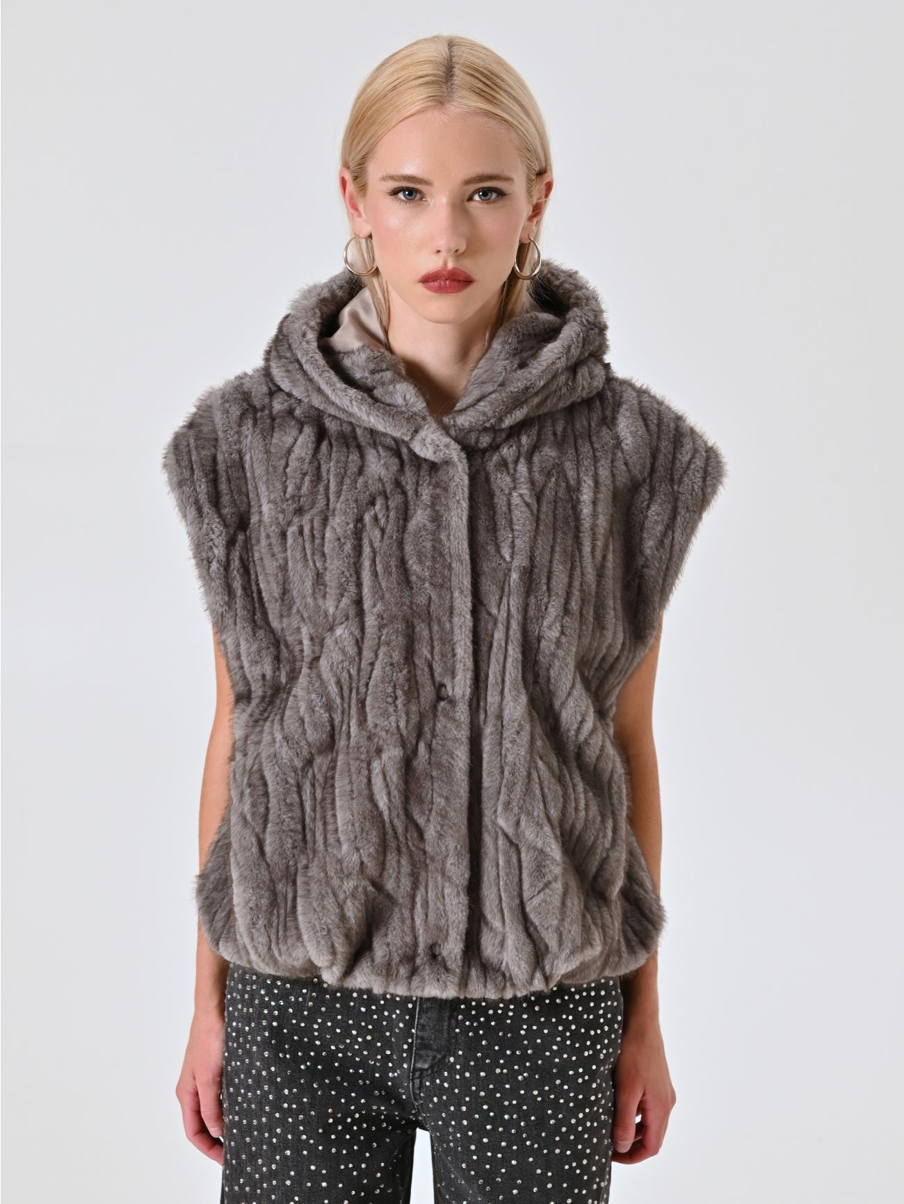Dit mouwloze jack valt op door zijn zachte, omhullende ontwerp en de stof met verticaal patroon die lijkt op bont. Het jack heeft ook een geïntegreerde capuchon, een ritssluiting aan de voorkant en een trekkoord aan de onderkant.