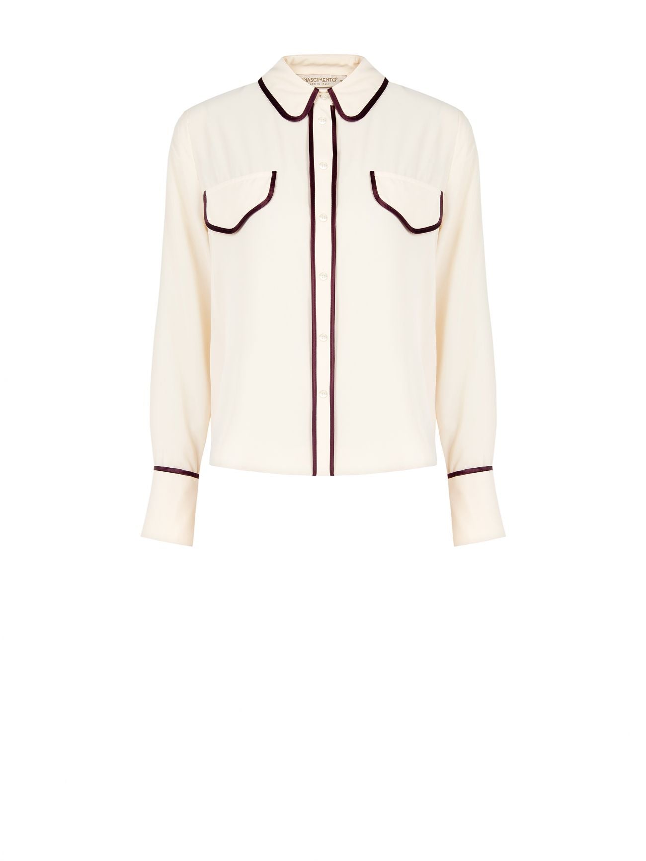 Het beige shirt met biezen is gemaakt van gedeeltelijk gerecyclede soepelvallende stof en heeft een minimalistisch ontwerp dat is verfraaid met praktische zakken op de borst en contrasterende bordeauxrode biezen. De zichtbare knoopsluiting versterkt de strakke, vrouwelijke stijl van het kledingstuk.