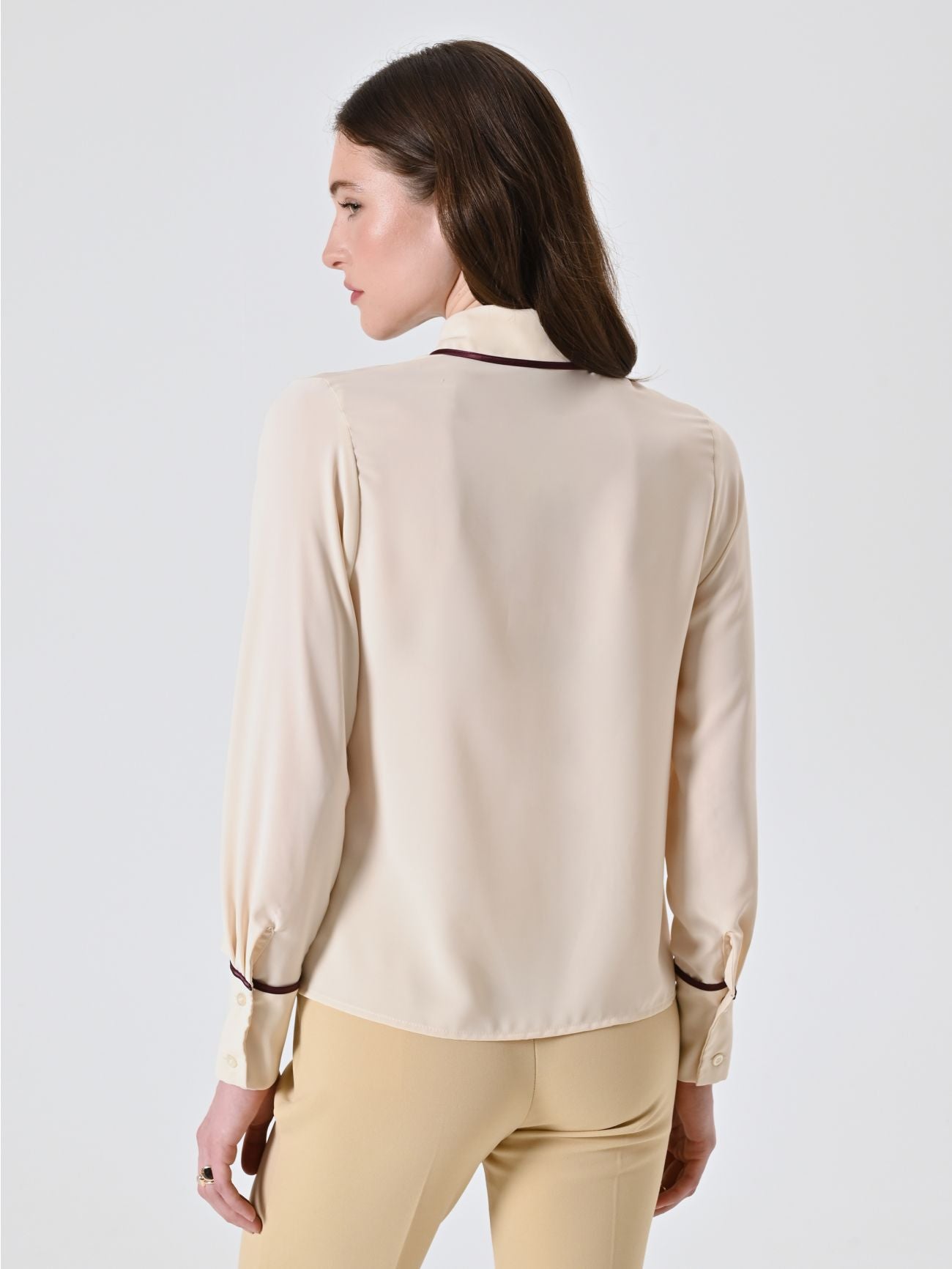 Het beige shirt met biezen is een elegant en eigentijds kledingstuk dat is ontworpen om uw kantoorlook een verfijnde touch te geven.