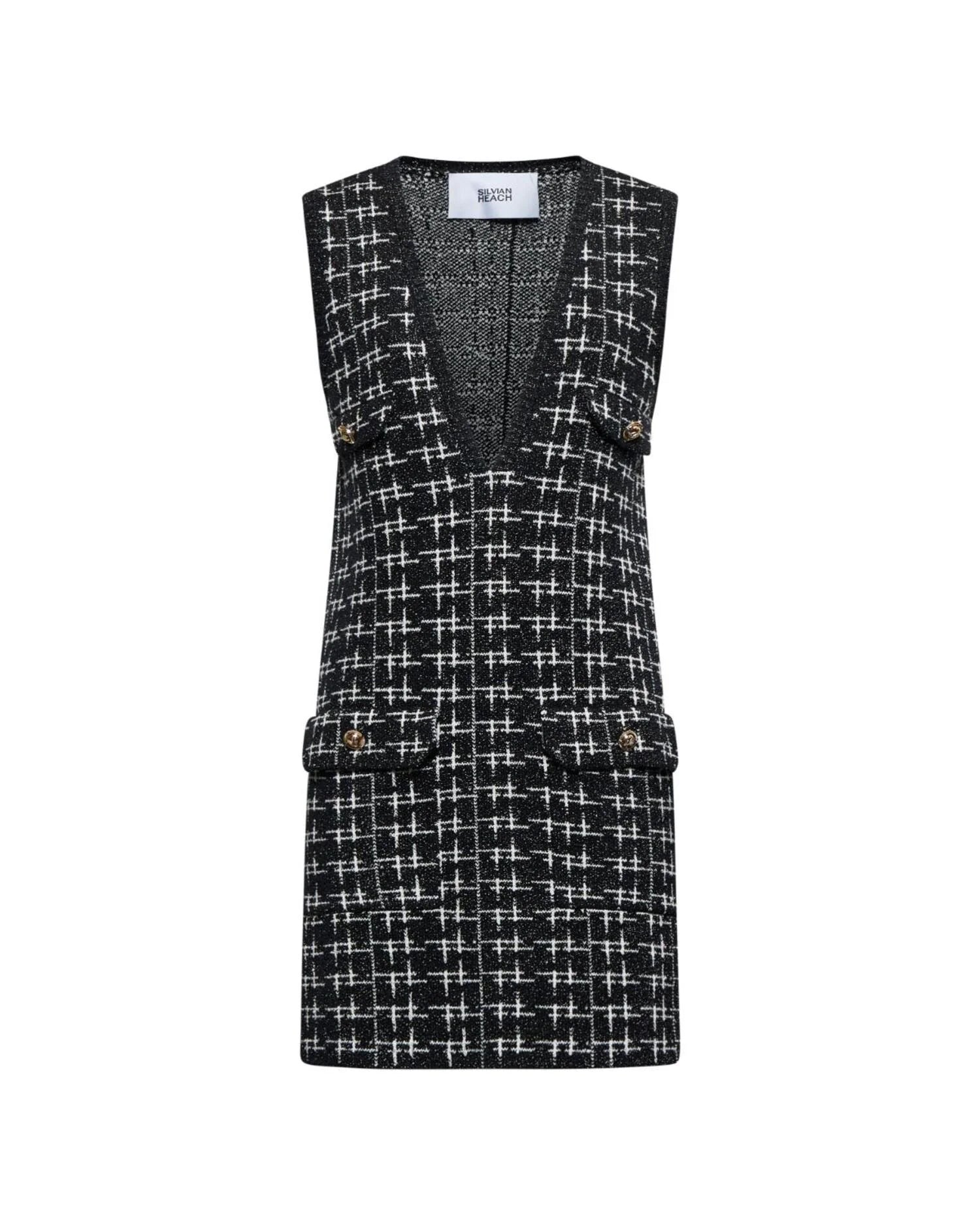 Een korte jurk met een uitgesproken structuur en een minimalistisch ontwerp. De mouwloze snit en opgestikte zakken maken hem eigentijds en praktisch, perfect om te combineren met hoge laarzen of stevige loafers.
